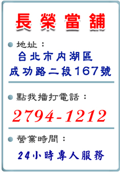 台北市當舖借款服務優質選擇就在台北市長榮當舖,合法經營台北市汽車借款、台北市機車借款、台北市支票借款、支票貼現,公認合法典當質借,貼心助您轉當降息,是民間救急最好的處所,多元借款選擇方案,房屋借款,企業周轉、精品典當質借都都歡迎來長榮當舖洽詢服務。